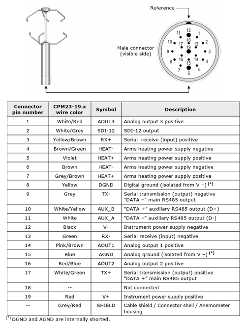 - Three analog outputs, for wind speed and direction or for wind U-V-W cartesian components. The type of analog output depends on model.